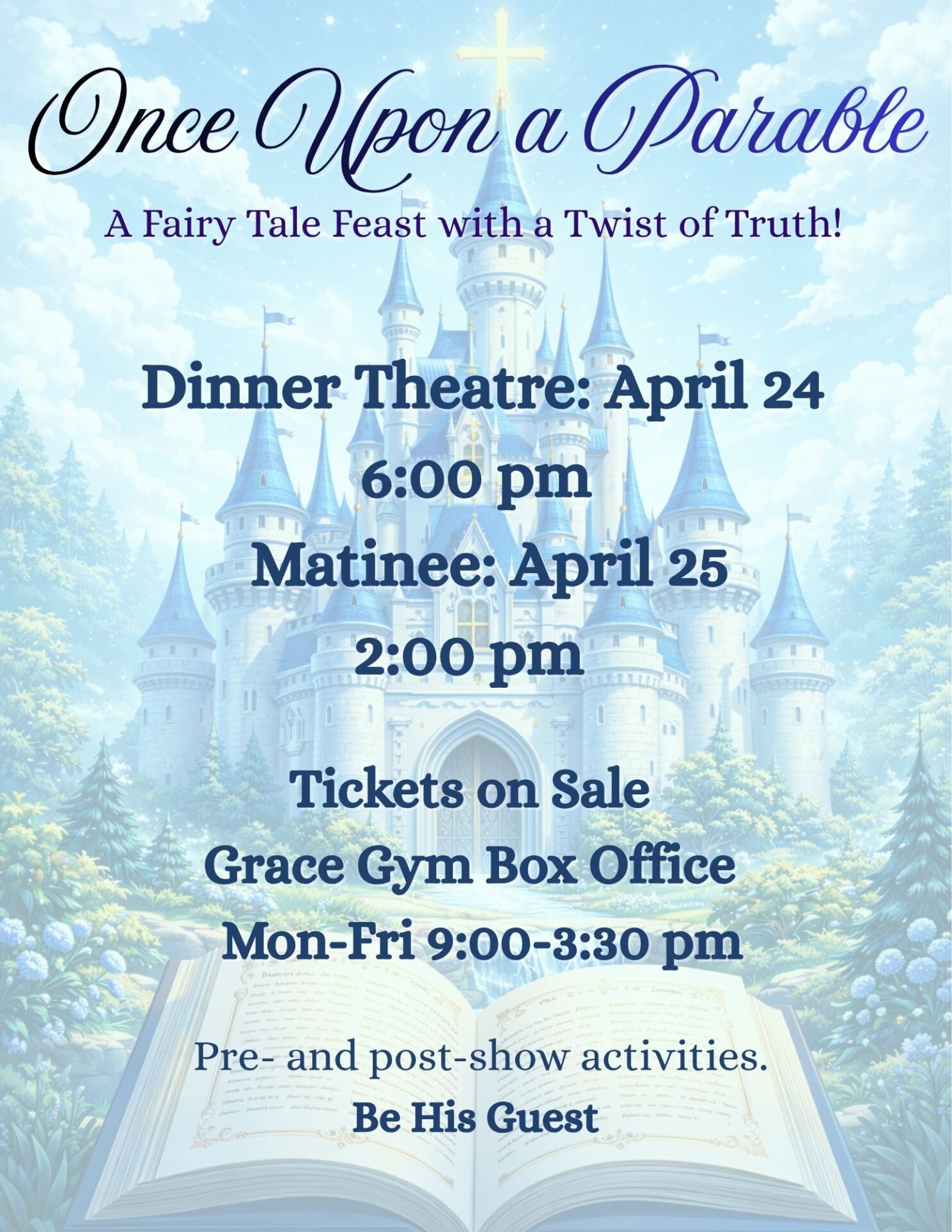 Agape Christian School’s Drama Club will be hosting their production entitled, “Once Upon a Parable” on April 24-25, 2026. The dinner theatre is scheduled for April 24, 2026, at 6:00 p.m., and the matinee is scheduled for April 25, 2026, at 2:00 p.m.