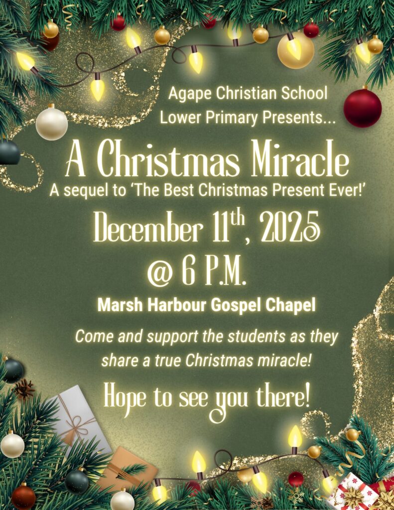 Agape Christian School’s lower primary (grades 1-3) students plan to present a Christmas production entitled “A Christmas Miracle” on Thursday, December 11, 2025, at 6 P.M at Marsh Harbour Gospel Chapel.